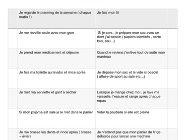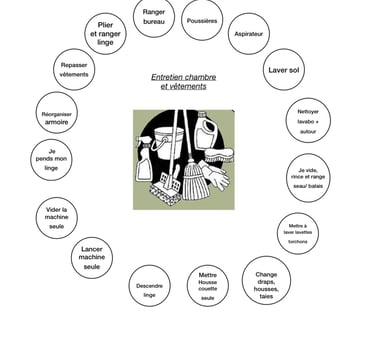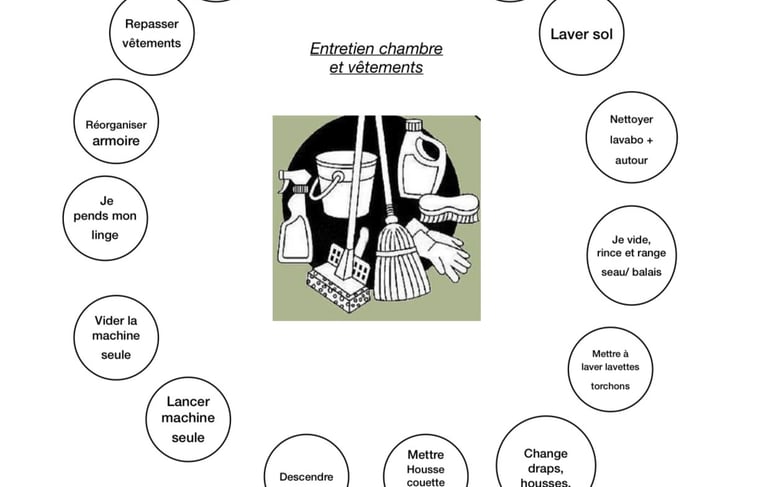 Le quotidien : En tant qu’éducatrice libérale, j’accompagne des jeunes adultes et des adultes dans l’apprentissage et la consolidation des gestes quotidiens : organisation de la chambre, hygiène, habillement, gestion du linge, préparation des repas… Mon approche est concrète, bienveillante et centrée sur la personne : j’observe, je décompose les tâches en petites étapes, j’entraîne et je crée des aides visuelles ou matérielles sur mesure (fiches, plannings, supports…).